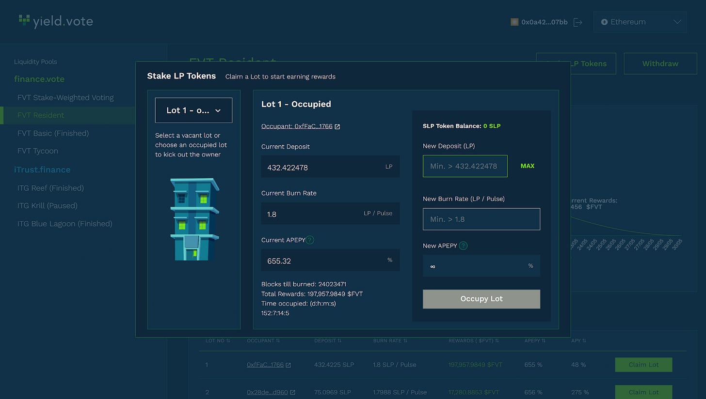 To claim the Lot, on the right, you’ll need to input a “New Deposit” and “New Burn Rate”. Remember that if you are “stealing” an occupied lot, both will need to be higher than what’s the current owner has staked in order to claim it.