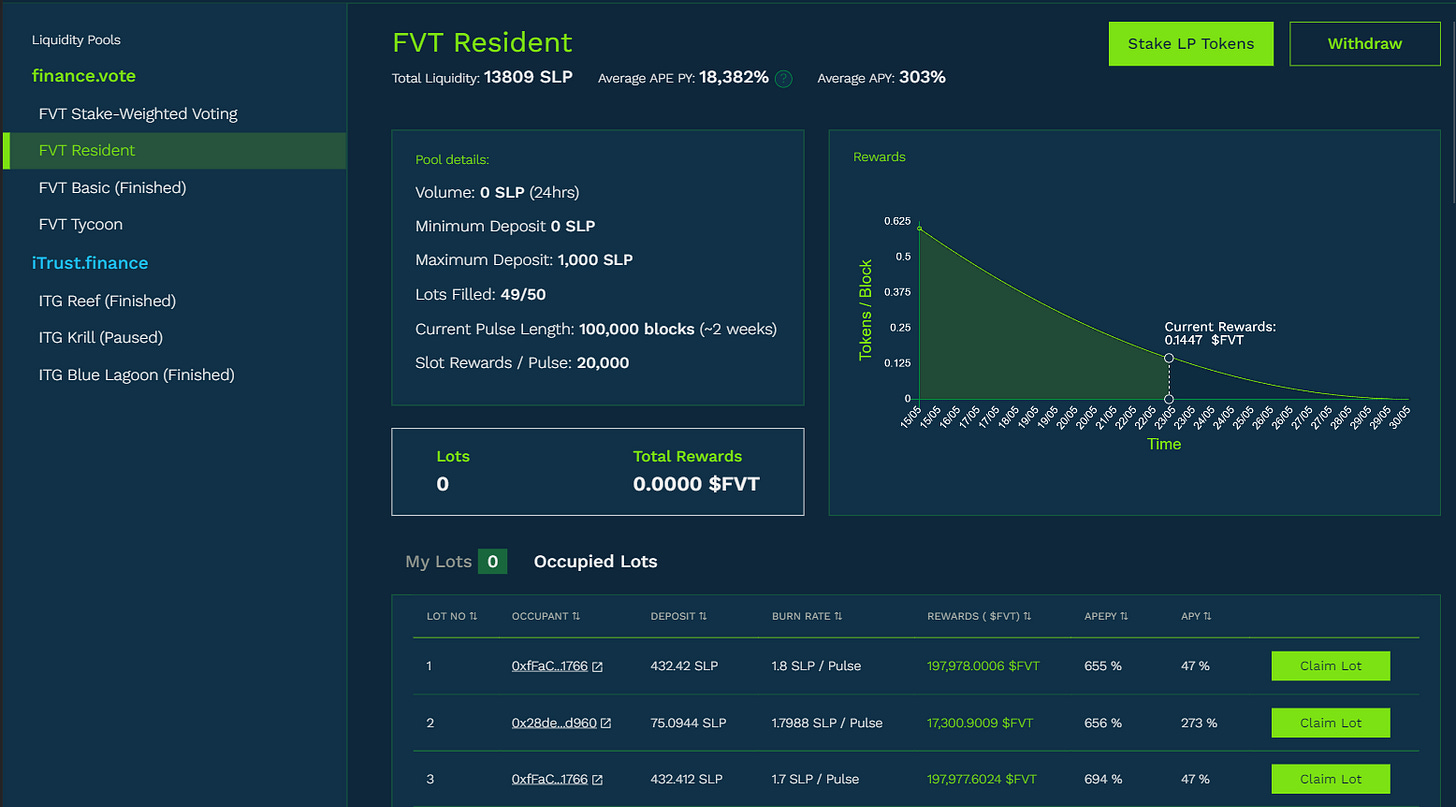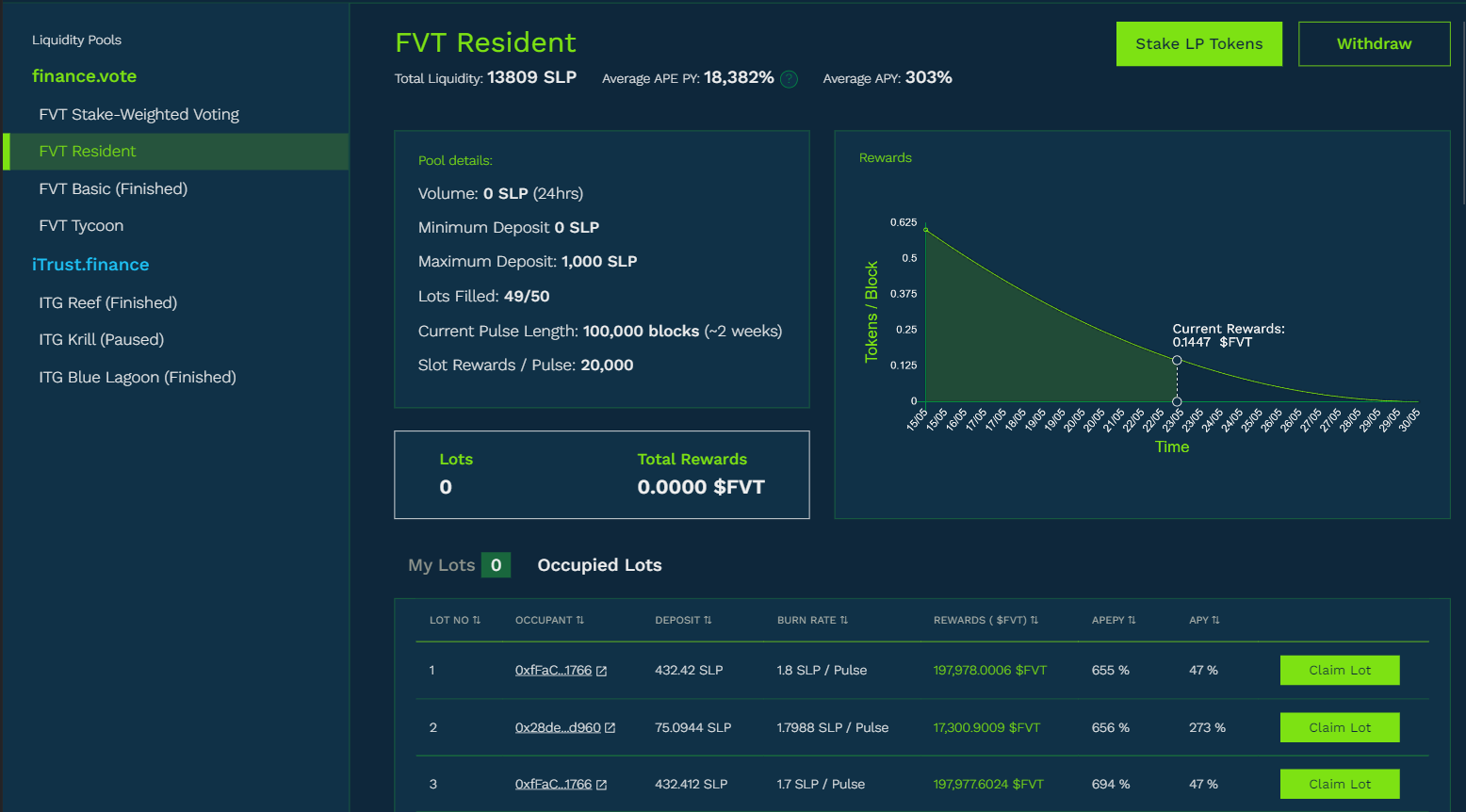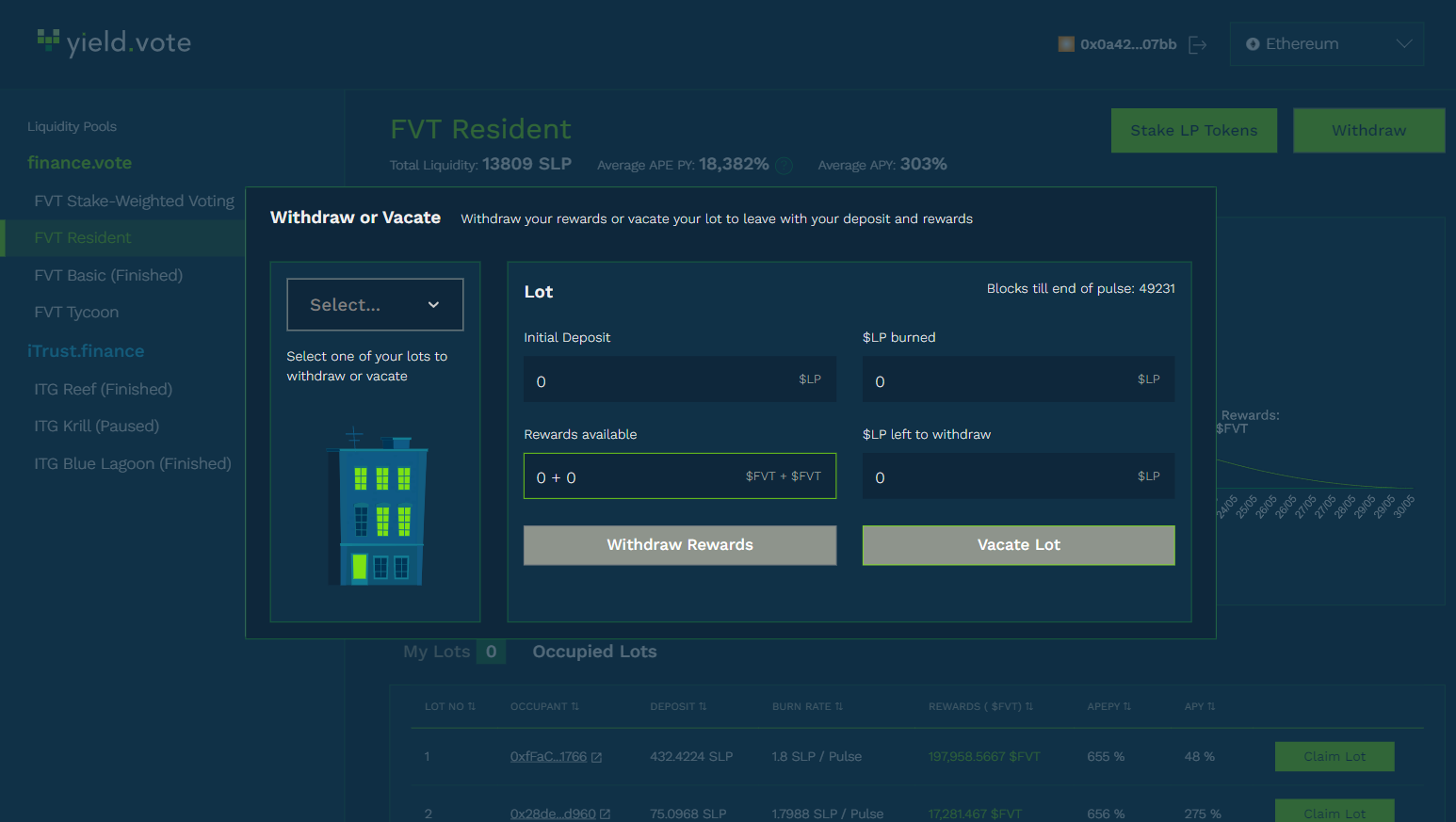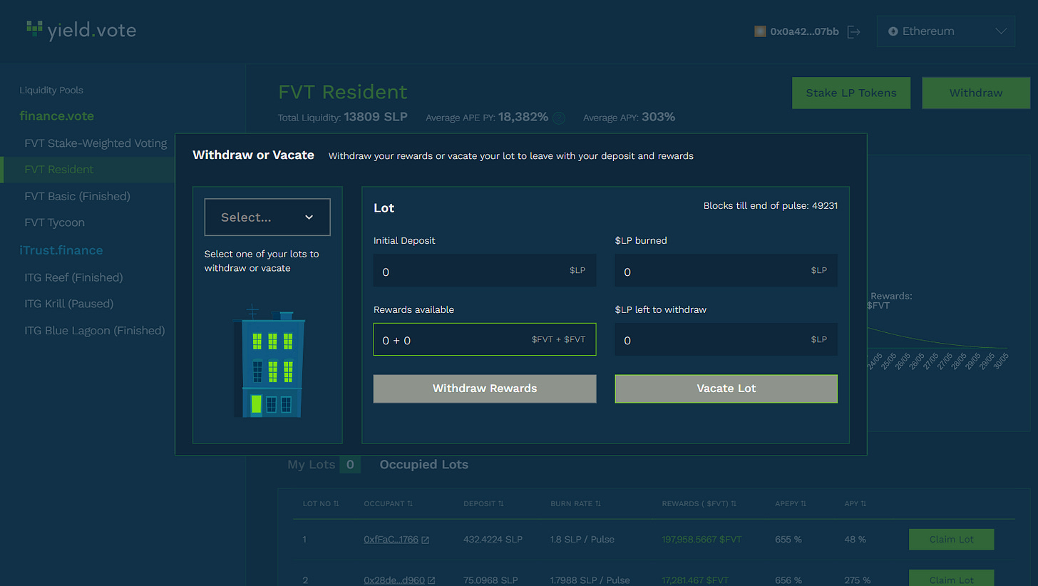 You may also VACATE your Lot by pressing the “Vacate Lot” button and approving the transaction from your wallet’s popup. Upon vacating, your PGL tokens along with your reward tokens are returned to your wallet minus the PGL tokens that were burned (your tax) during your Lot occupancy.